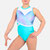 Dieser originelle Turnanzug besticht im oberen Teil durch einen weissen Netzstoff sowie einem sublimierten Lycra-Stoff im ombré Style und ist unterlegt mit blickdichtem Stoff.